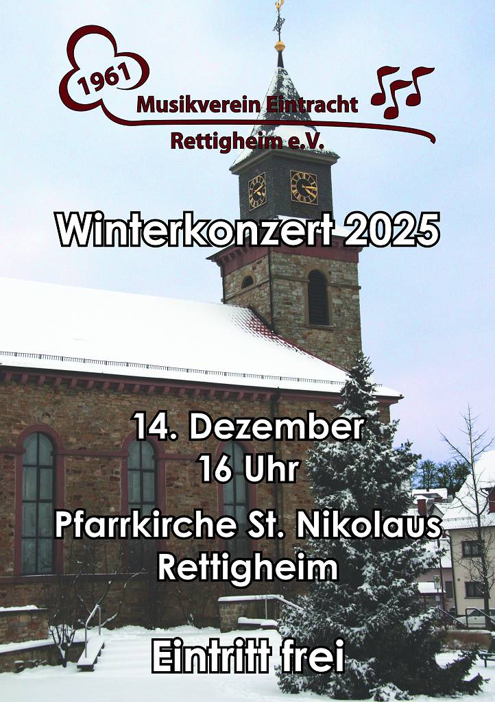 Das Blasorchester des Musikverein Eintracht Rettigheim e.V. unter der Leitung von Christiane Weinmann möchte Sie am 14. Dezember zu einem vielfältigen und abwechslungsreichen Konzertprogramm in die Pfarrkirche St. Nikolaus einladen.